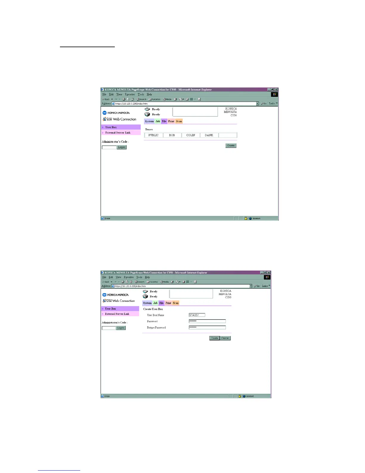 1) Using Internet Explorer, type the IP address of the Konica Minolta machine into