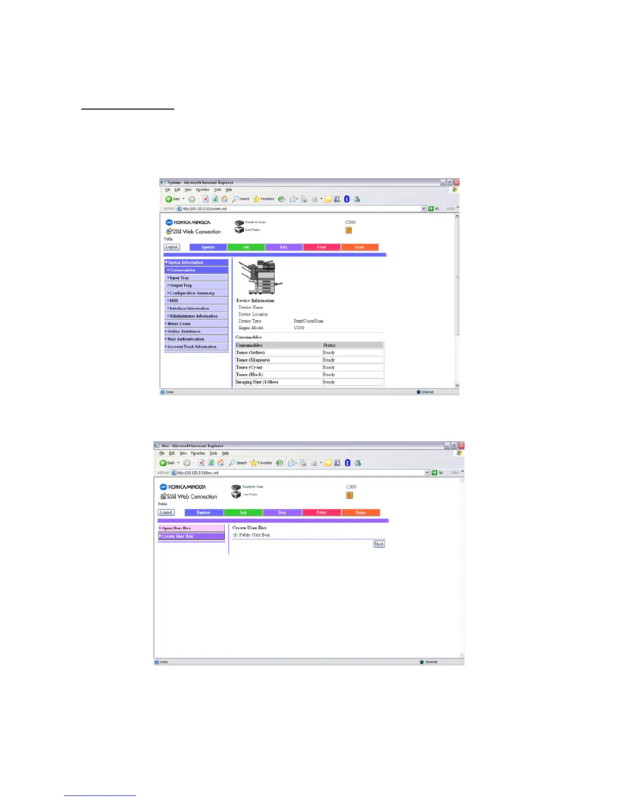 1) Using Internet Explorer, type the IP address of the Konica Minolta machine into