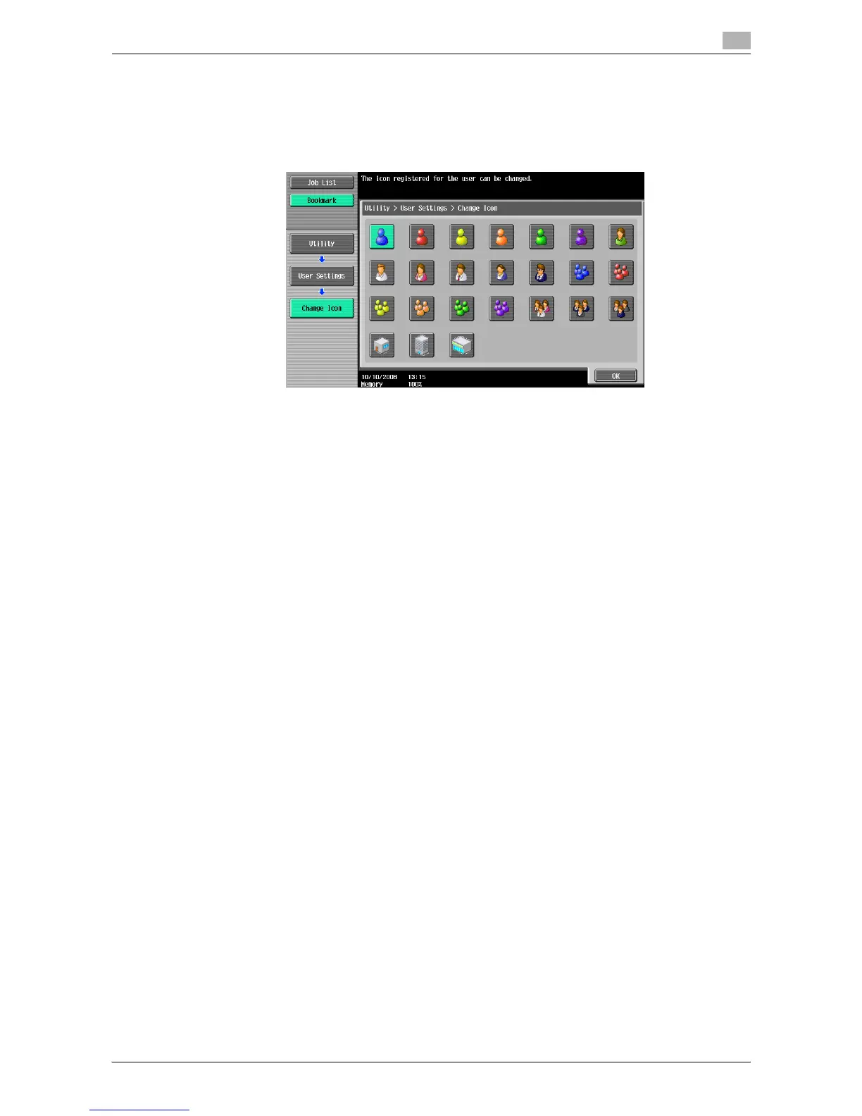 1 Press the [Utility/Counter] key ö [User Settings] ö [Change Icon].