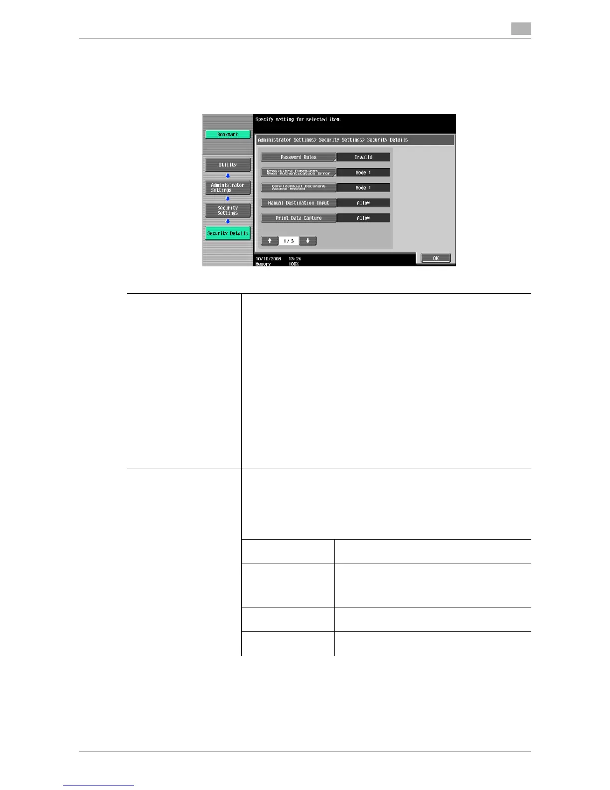 % Press the [Utility/Counter] key ö [Administrator Settings] ö [Security Settings] ö [Security Details].