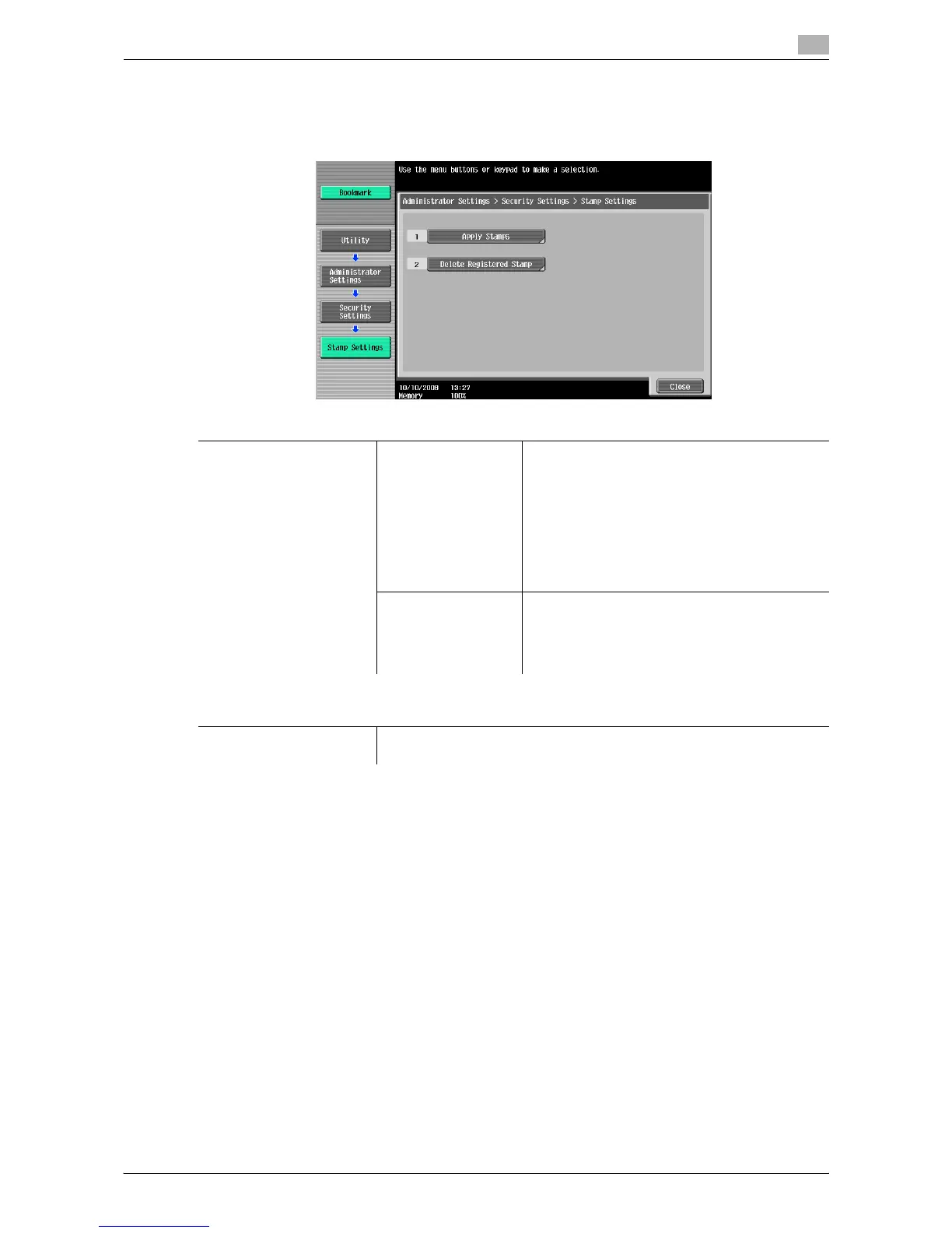 % Press the [Utility/Counter] key ö [Administrator Settings] ö [Security Settings] ö [Stamp Settings].