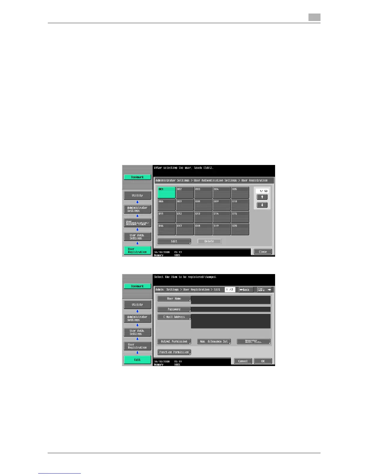 1 Use the control panel of this machine to display the Administrator Settings screen. Press [4 User