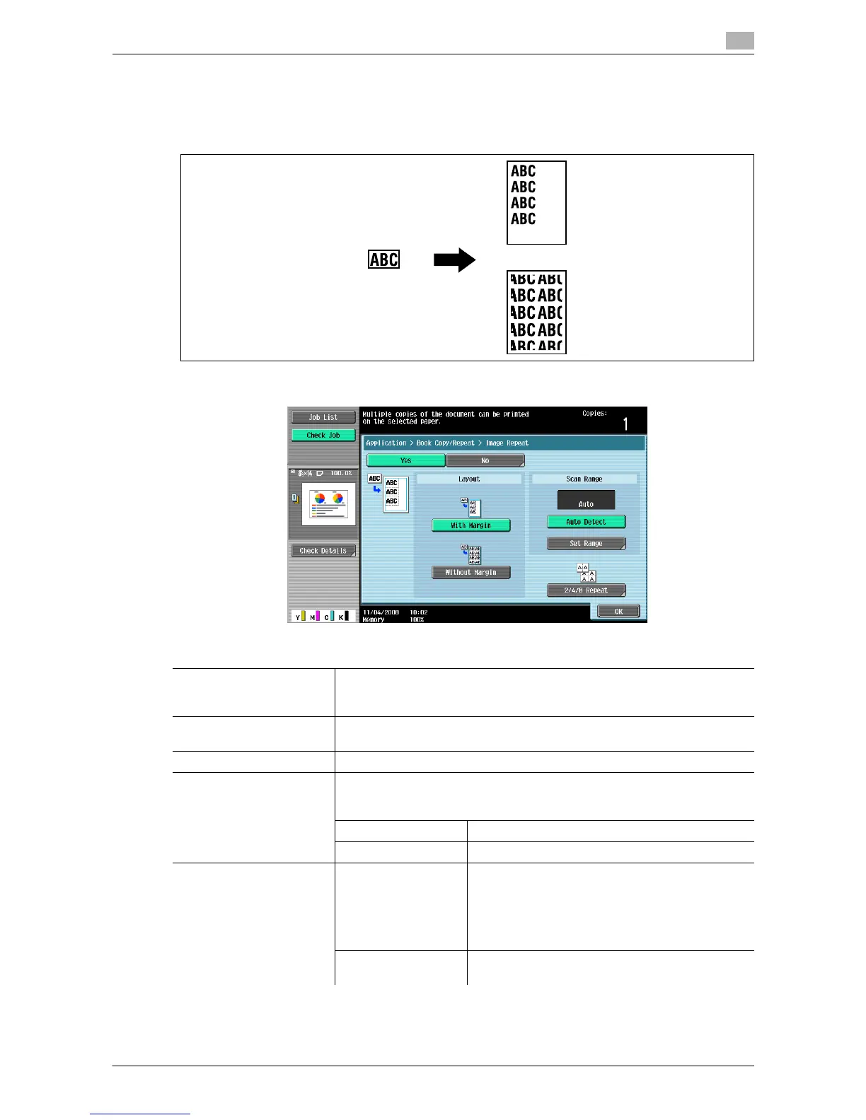 % Press [Application] ö [Book Copy/Repeat] ö [Image Repeat].