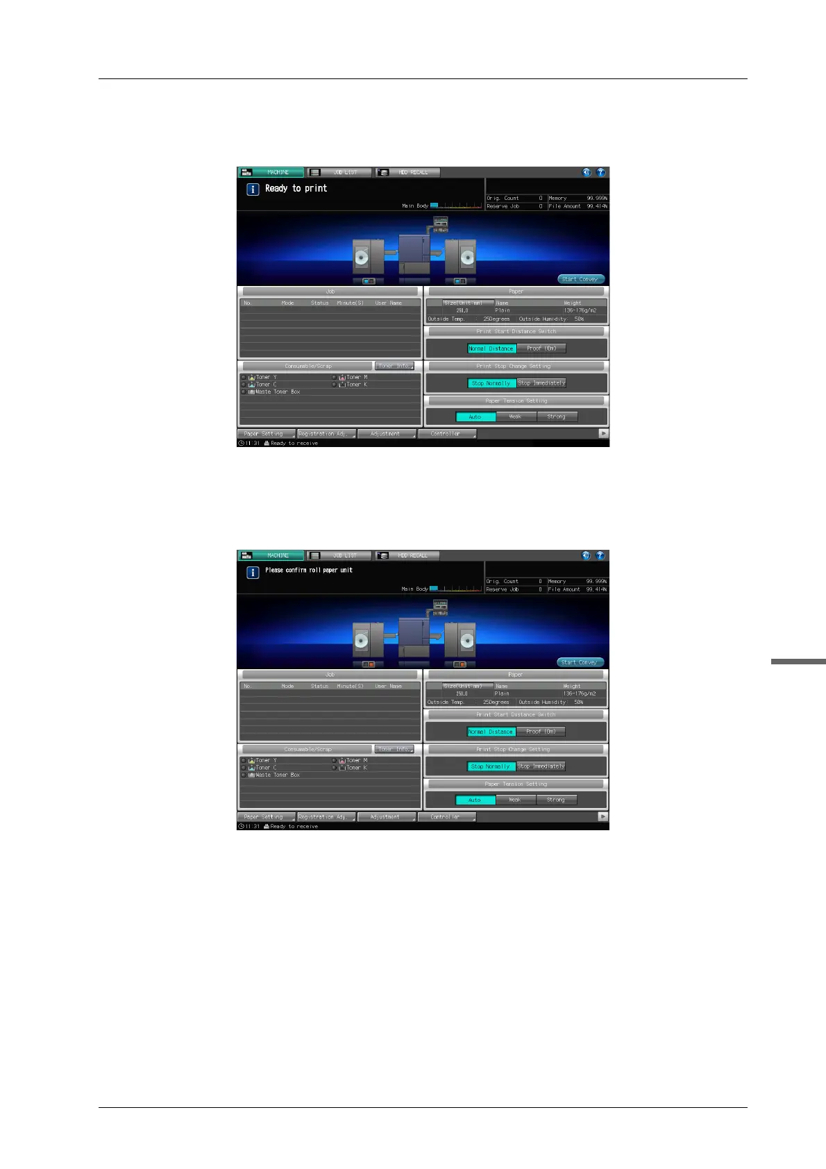 When the message [Please confirm roll paper unit] appears, turn on Roll Winder RW-101/Roll Winder