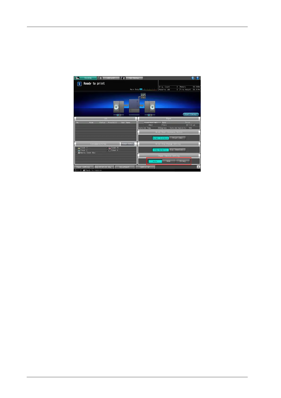% Touch [Auto], [Strong], or [Weak] in the [Paper Tension Setting] on the touch panel of the main