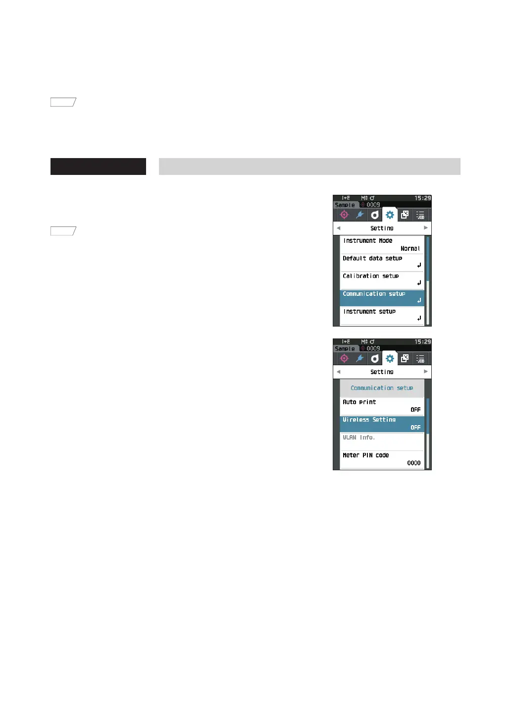 Information such as the access point and IP address registered to the instrument can be viewed on the instrument’s
