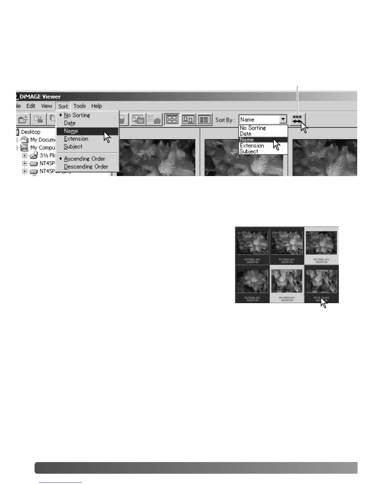 This function works with the thumbnail, icon, or list displays (p. 16). To sort the displayed images, use