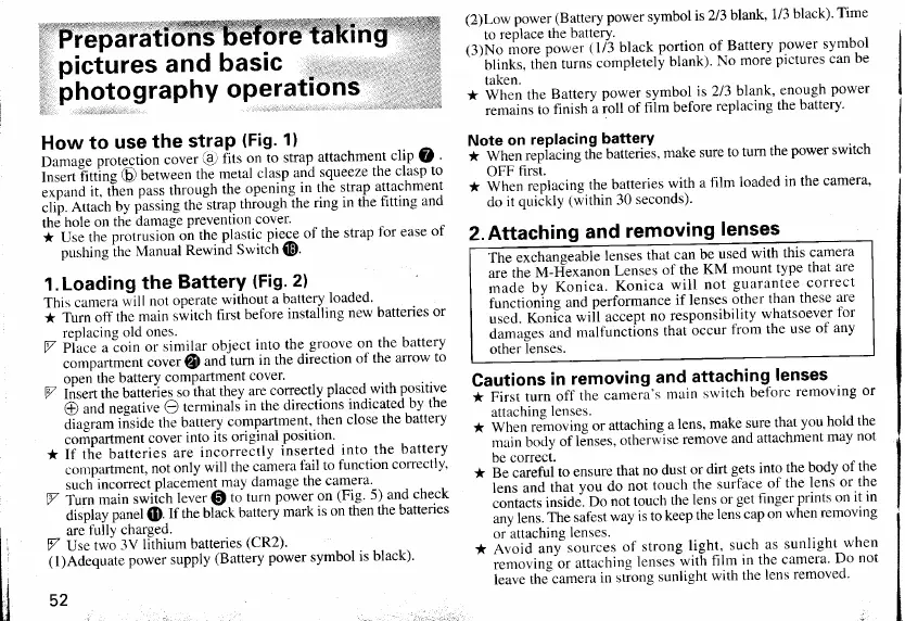 Konica Minolta HEXAR RF - Preparations before taking pictures and basic photography operations; Loading the Battery; Attaching and removing lenses