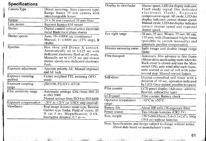 Konica Minolta HEXAR RF - Specifications