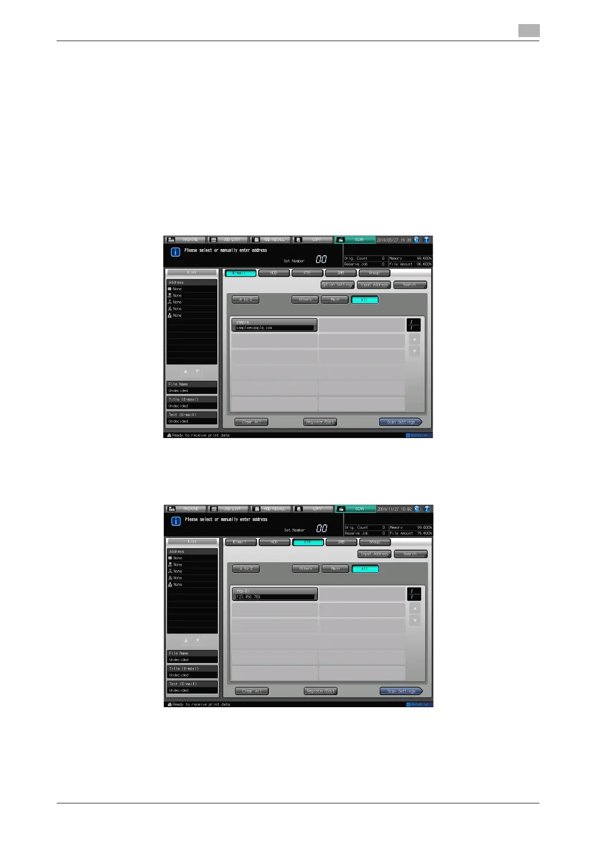 of the scan screen can be set at [Utility/Counter] - [User Setting] - [Scan Setting]. For details, refer