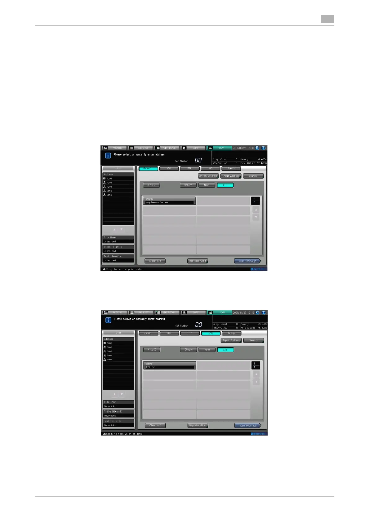 % In the initial settings, the Select Addresses screen (E-mail) is displayed. The default destination tab