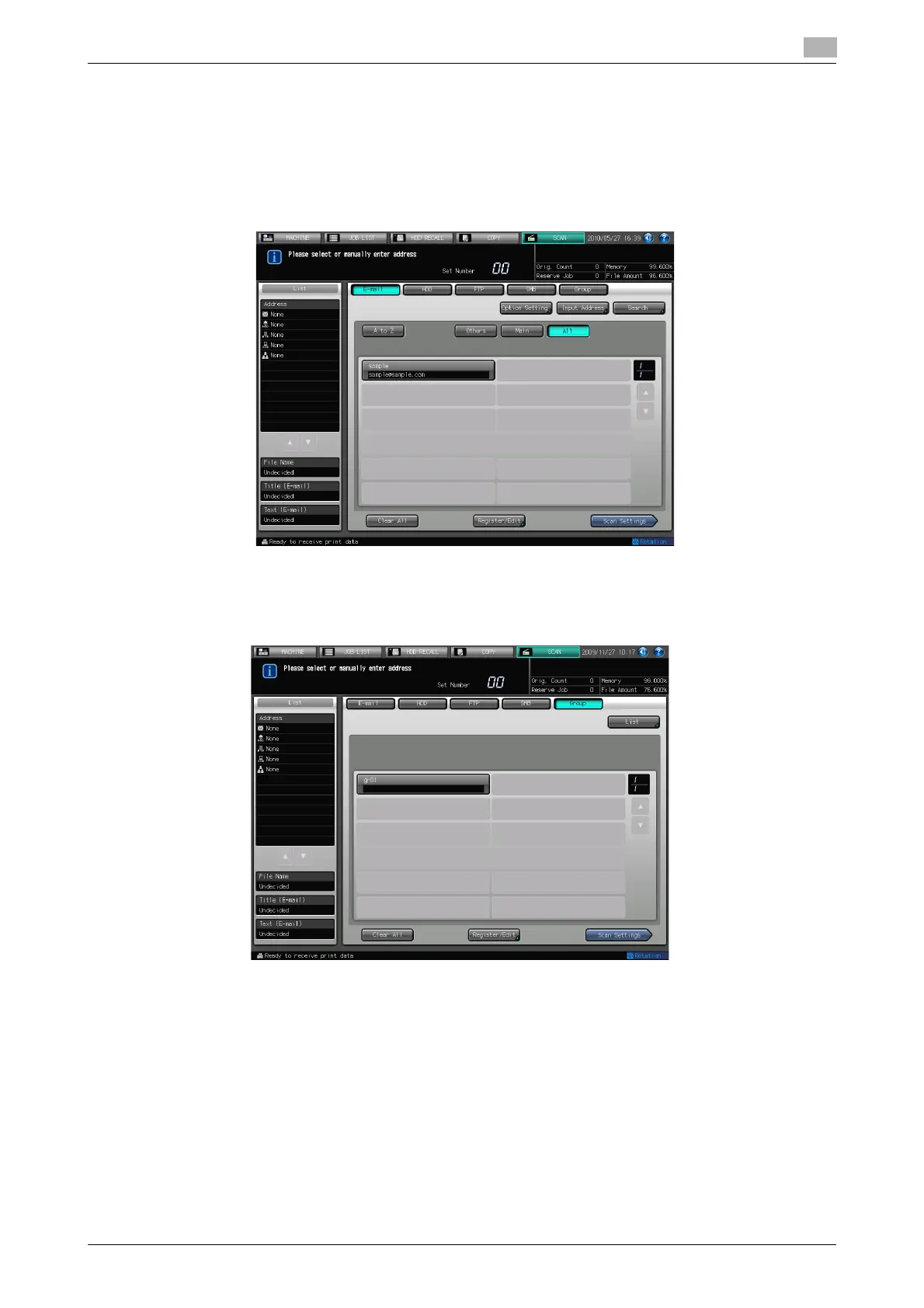% In the initial settings, the Select Addresses screen (E-mail) is displayed. The default destination tab