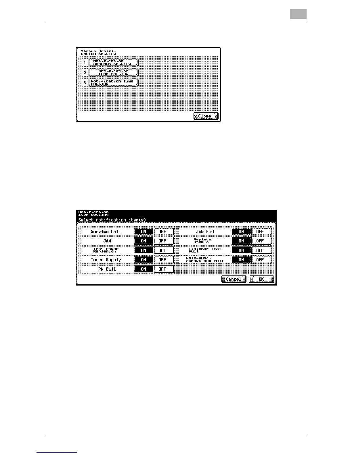 1 In the Status Notification Setting screen, touch [2 Notification Item Set-