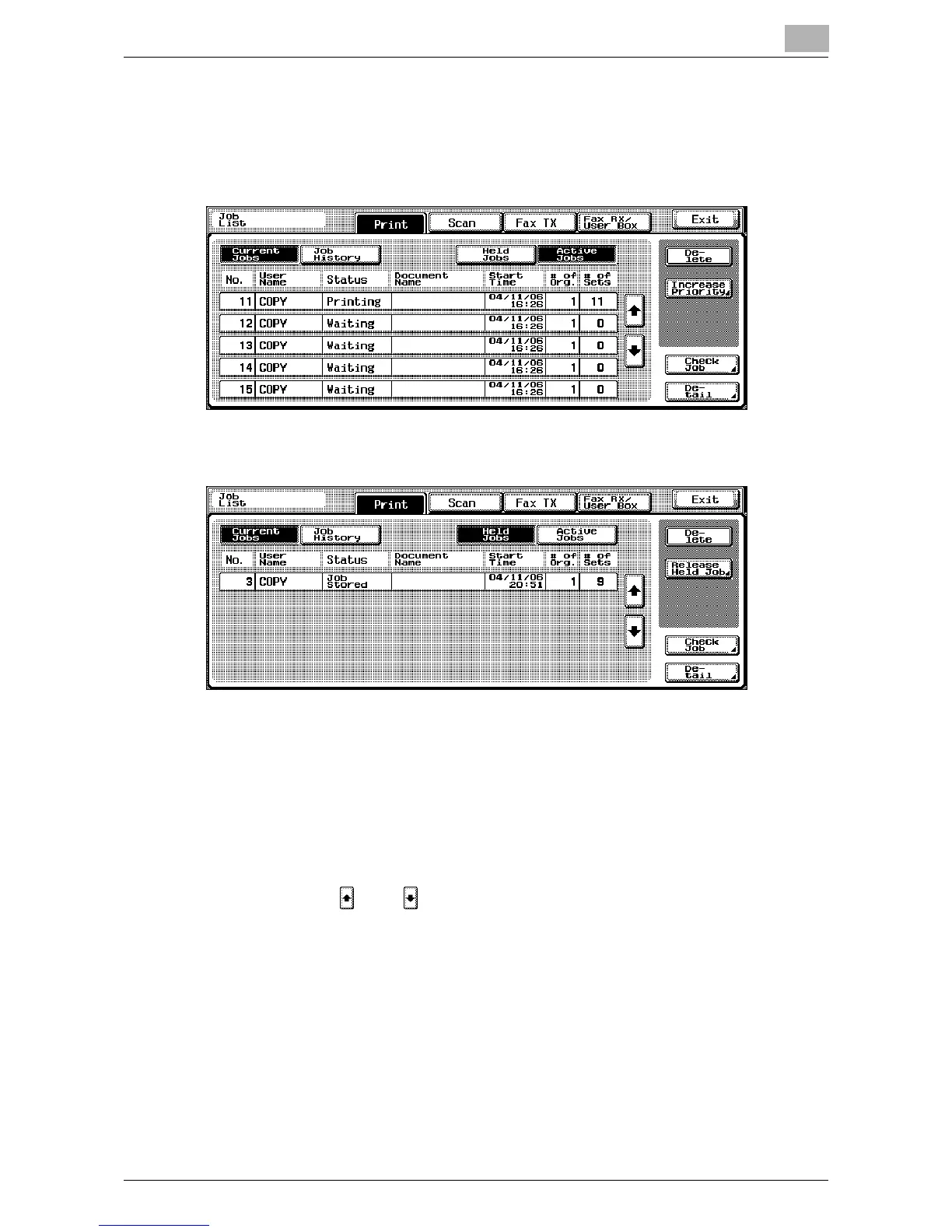 touch [ ] or [ ] until the desired job is displayed.