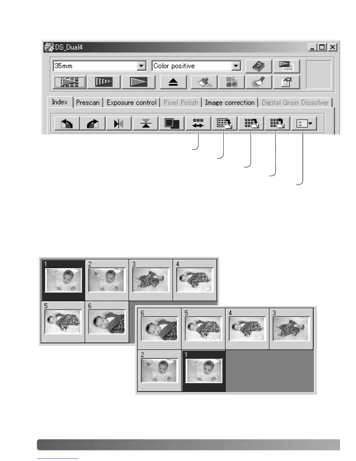 the roll. When scanning film strips, the order of the index thumbnails can be reversed