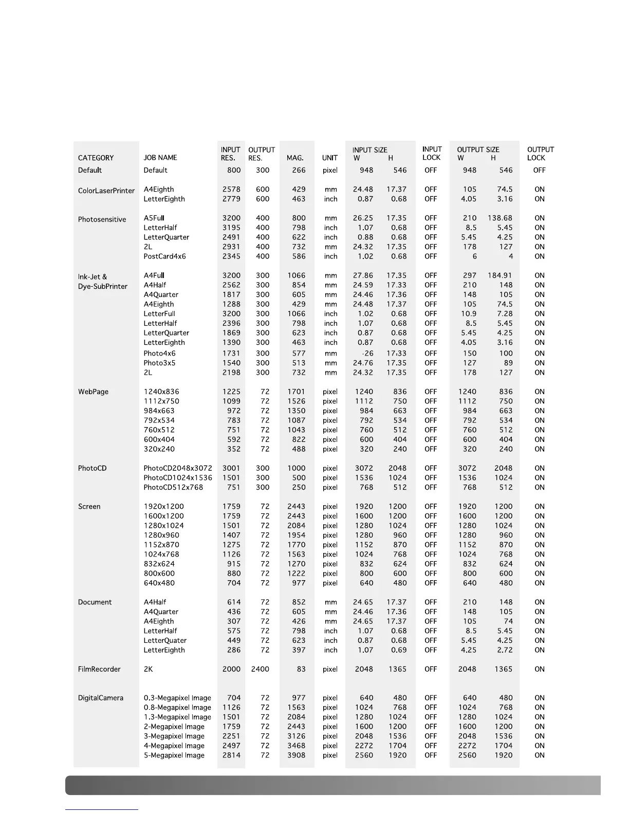 making-the-final-scan section on page 34. The following charts list the parameters of