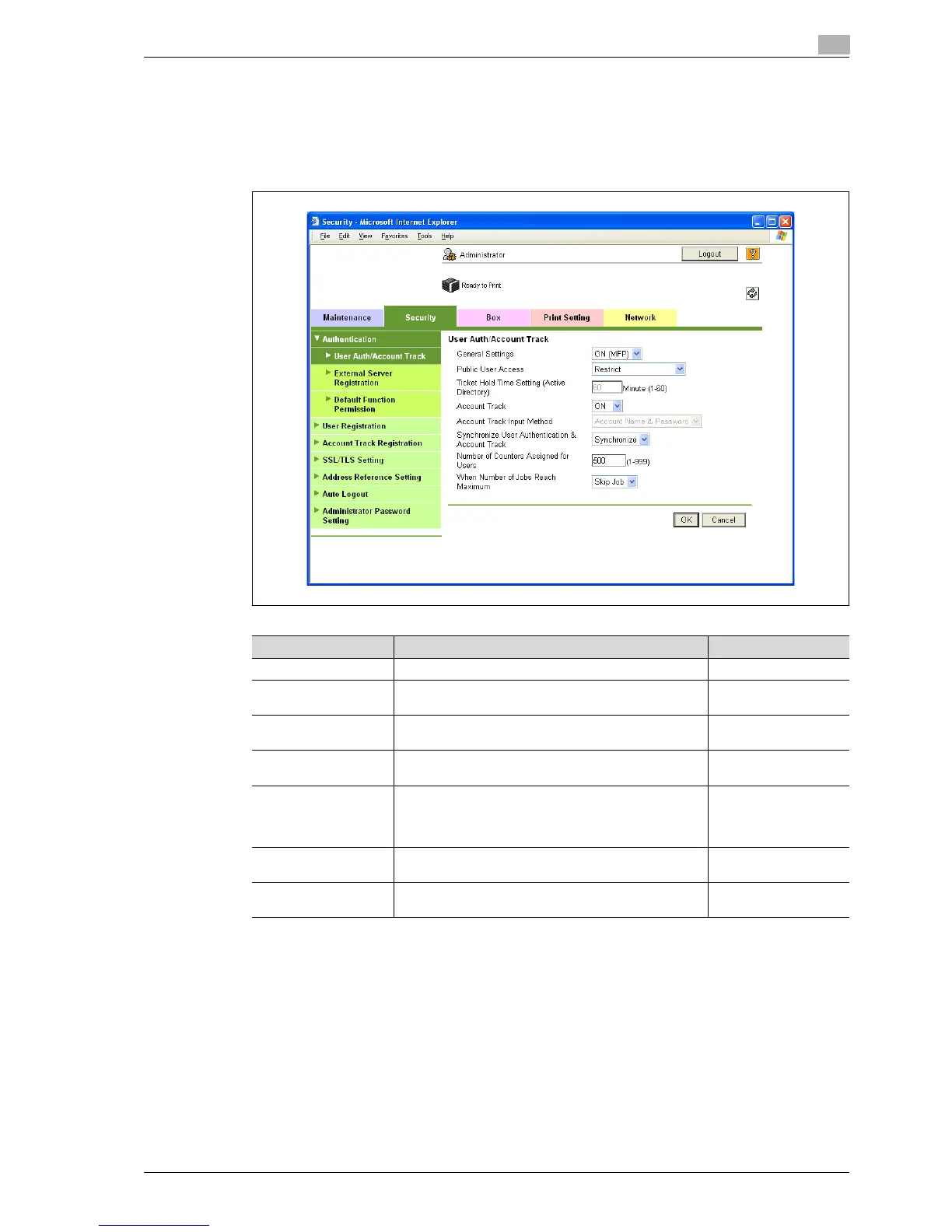 1 In Administrator mode of PageScope Web Connection, select the Security tab - "Authentication" -