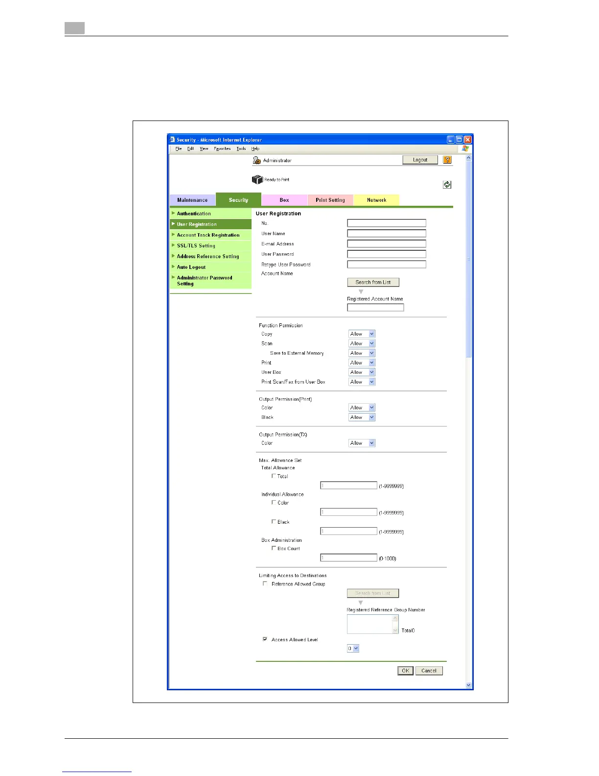 1 In Administrator mode of PageScope Web Connection, select the Security tab - "User Registration" -