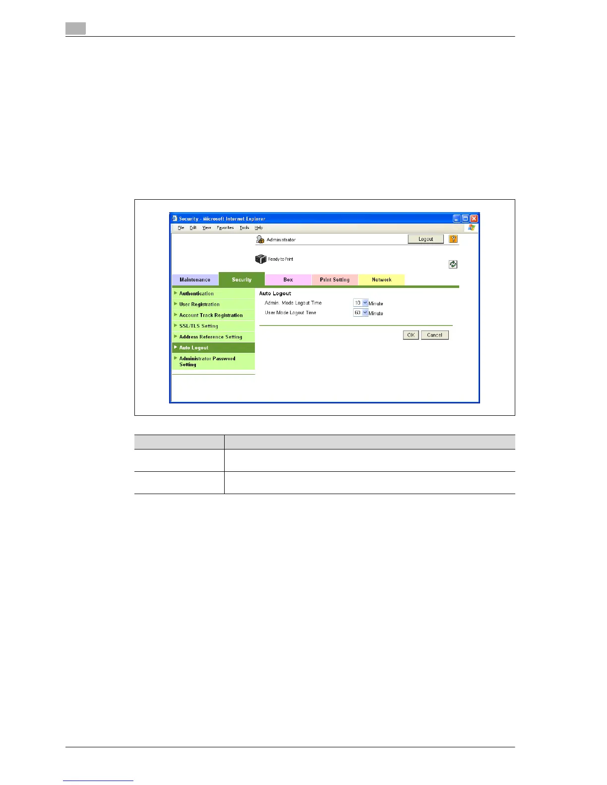 1 In Administrator mode of PageScope Web Connection, select the Security tab - "Auto Logout".