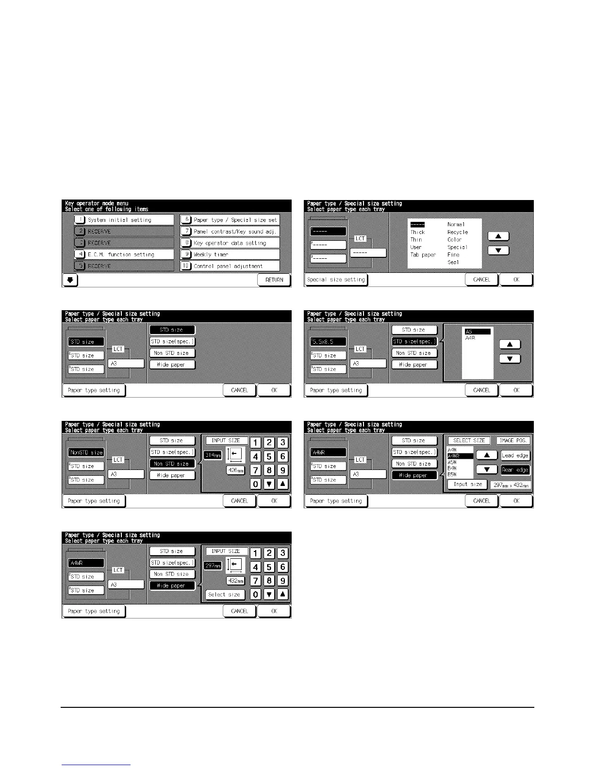 Special Size Setting Screen (Non STD size) Special Size Setting Screen (Wide size paper)