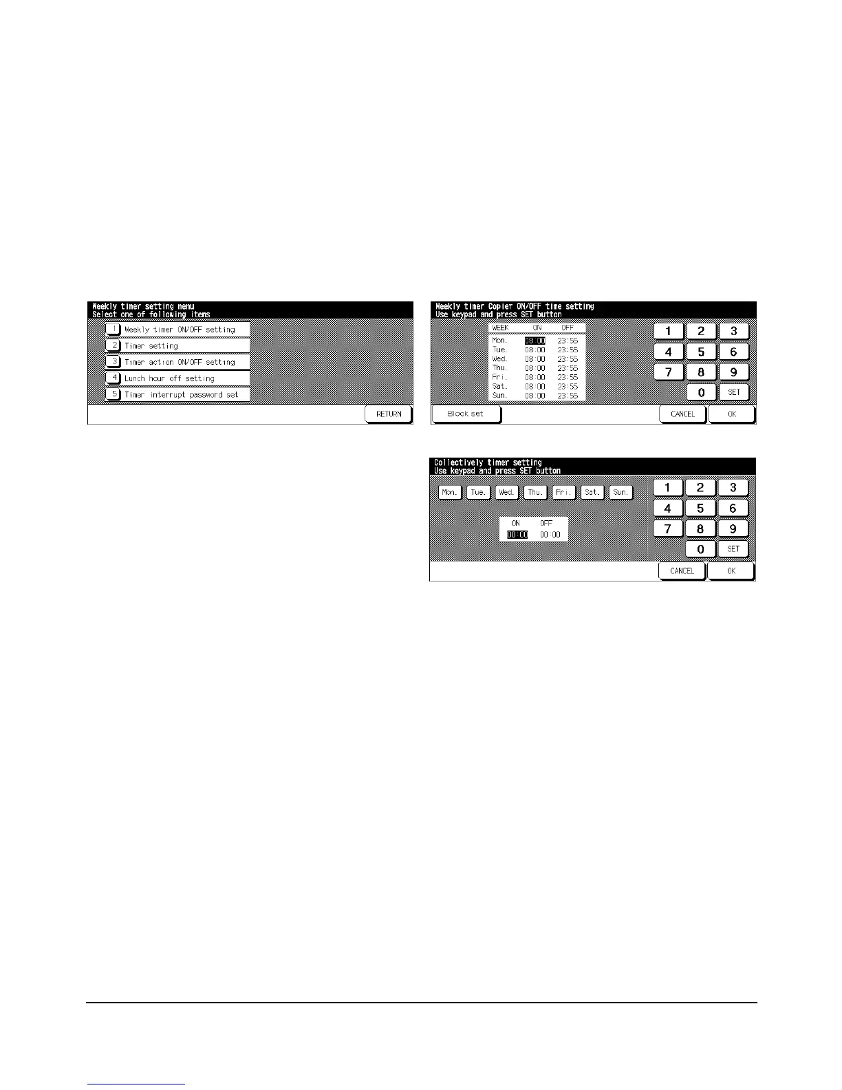 Weekly Timer Setting Menu Screen Weekly Timer On/Off Time Setting Screen