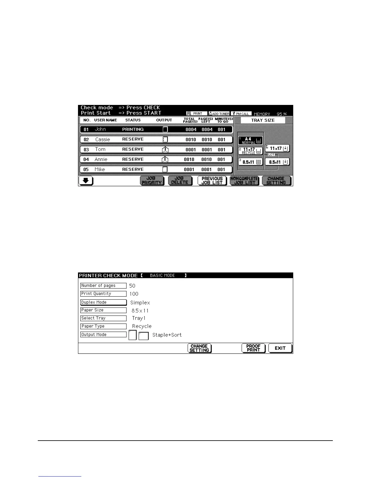 When you press the [CHECK] key on the control panel, the Check Screen displays as