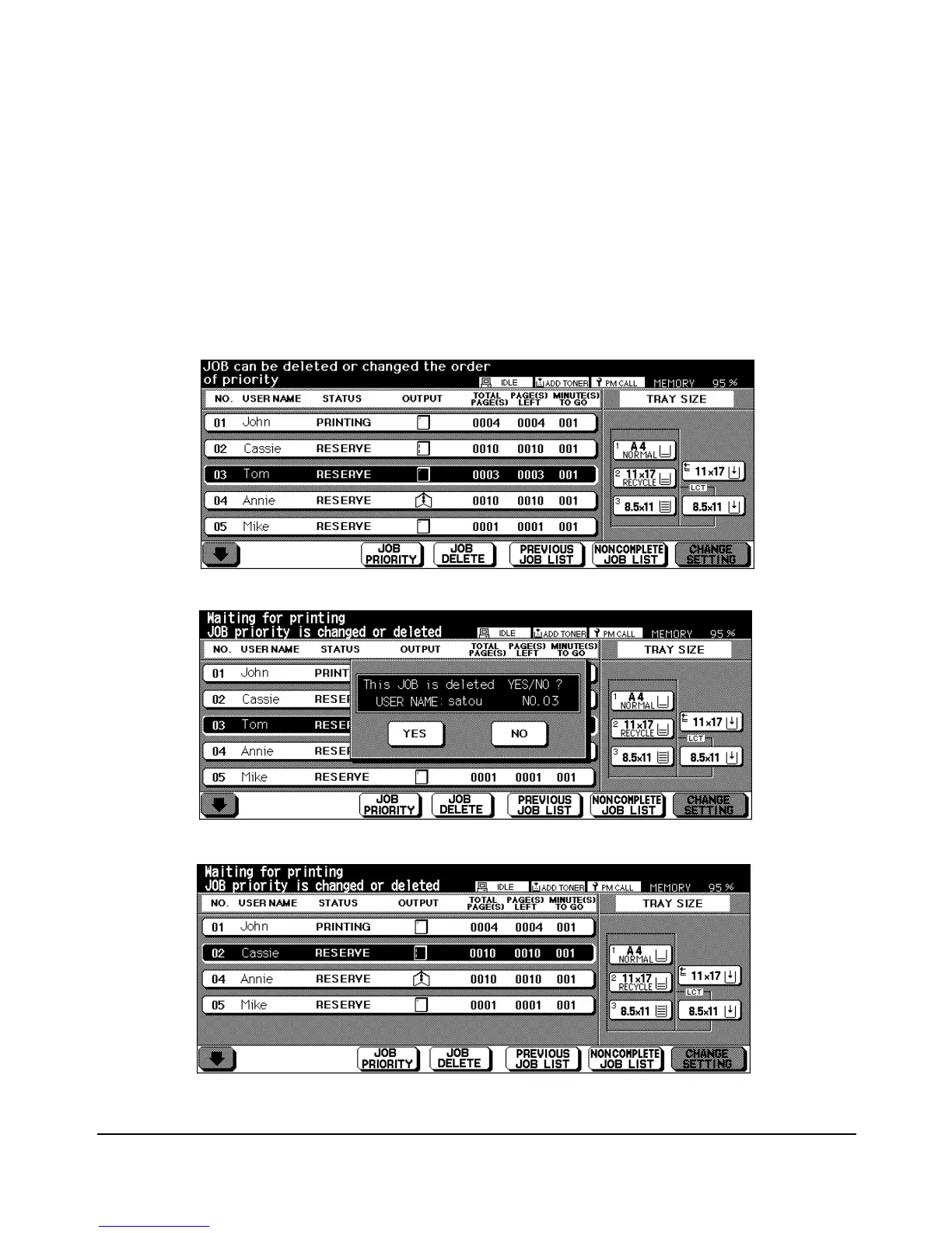 Touch the Status key to highlight a Job, then touch the JOB DELETE key to delete the Job.