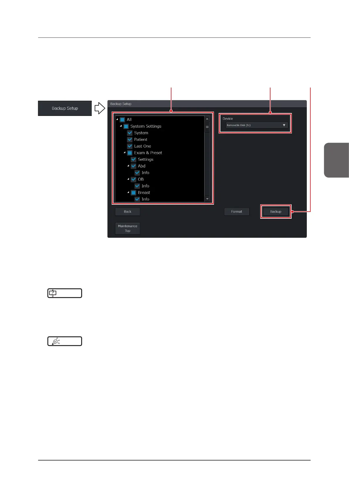 • You can back up information of a user presets by selecting the check box of the user preset’s name under [Exam &