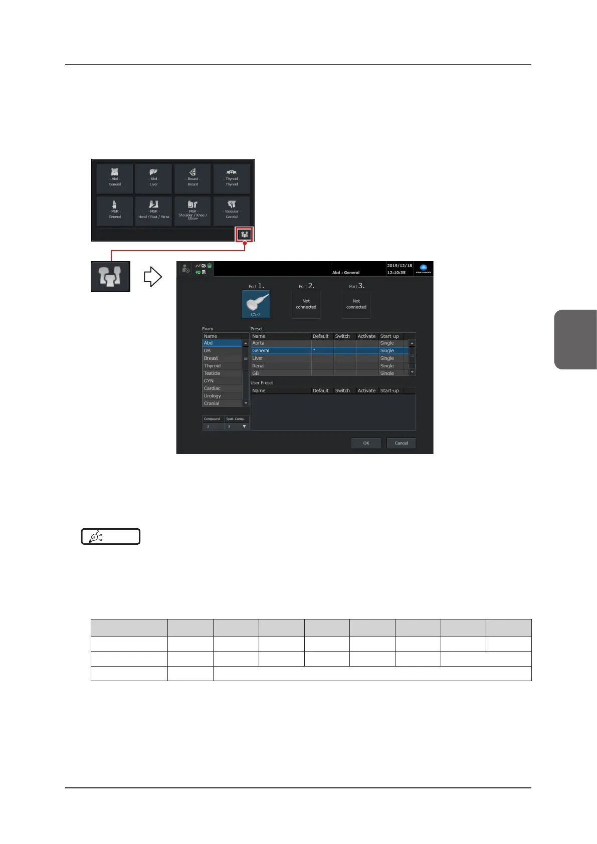 • If you select a preset or user preset in the exam select shortcut setting window and the transducer set in the [Switch]