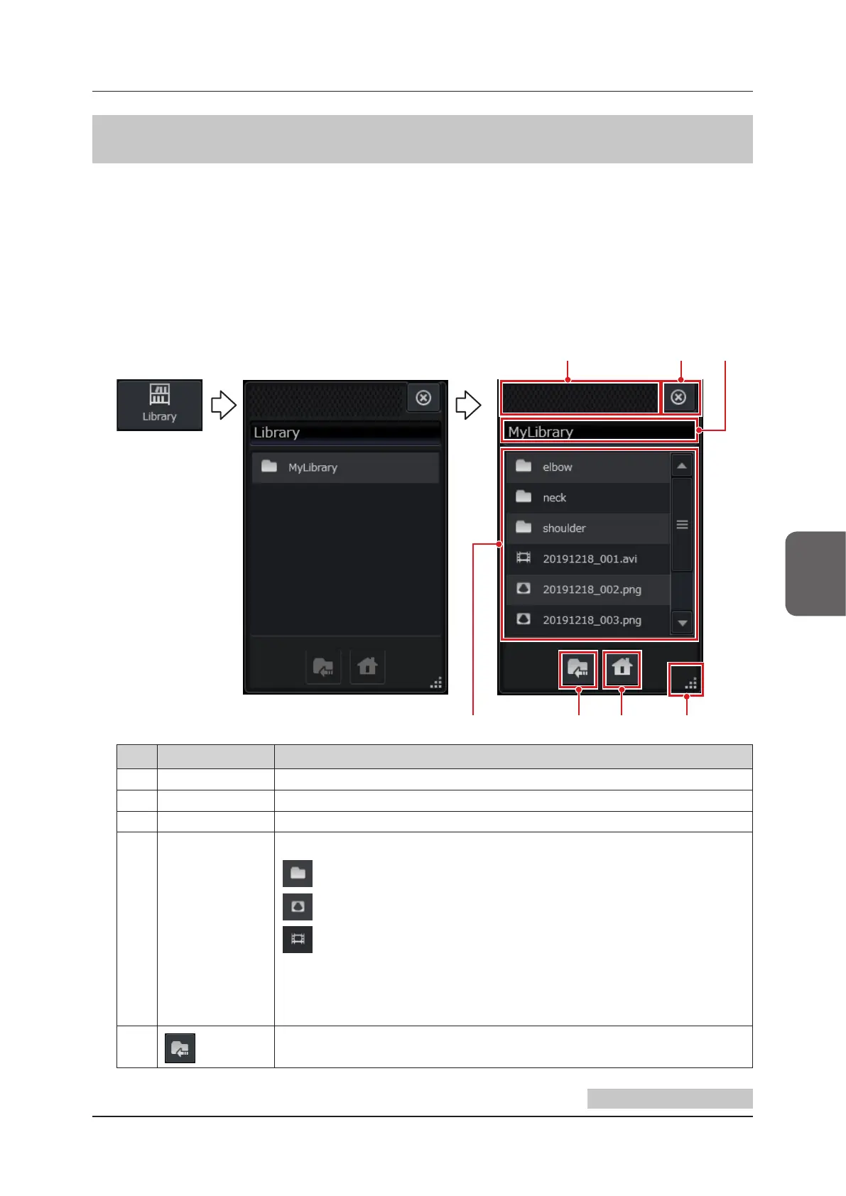 (3) Current folder Displays the current folder’s name. When it is the library home folder, it displays “Library”.