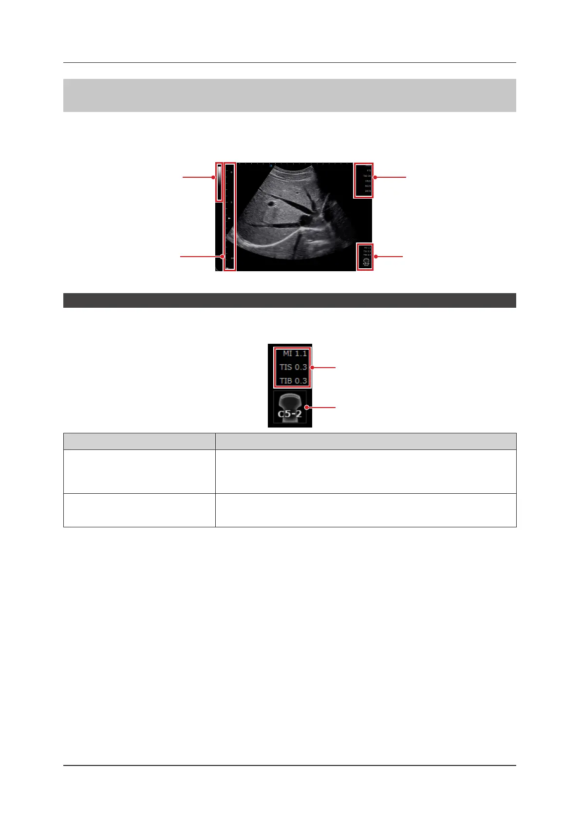 • Starting at the top: [MI], [TIS] and [TIB] (or [TIC]) values, which are displayed only