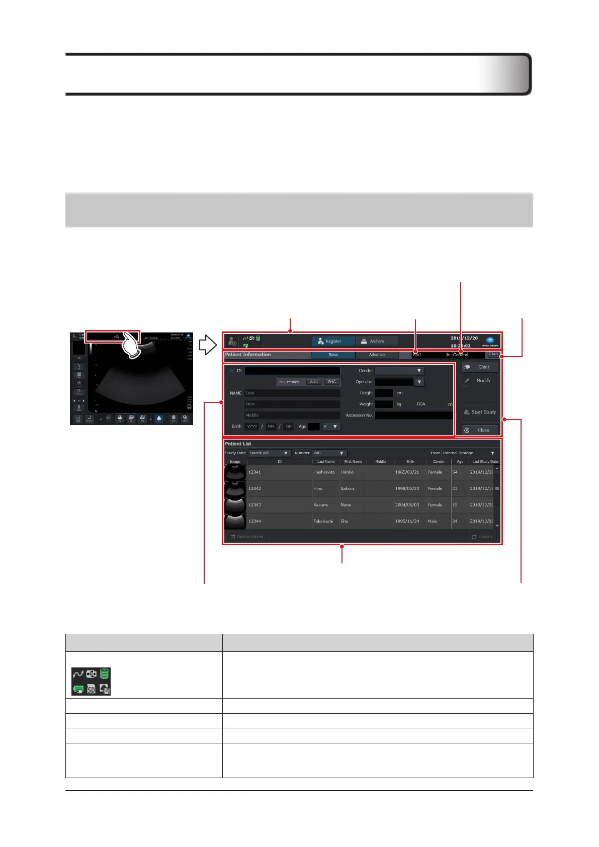 To change to the [Patient] screen, touch the patient register icon at the top of the study screen.
