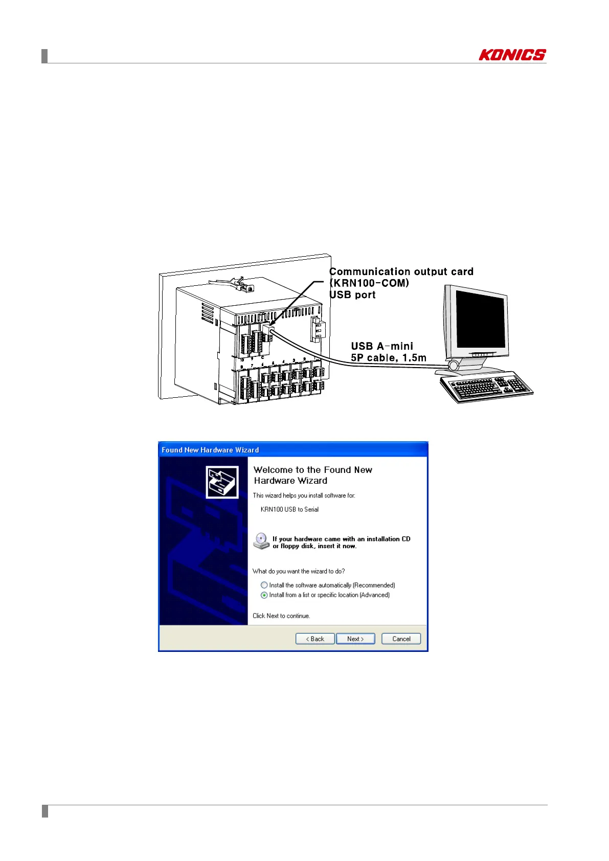 2nd Connect KRN100 USB port of communication output card(KRN-COM) and PC USB