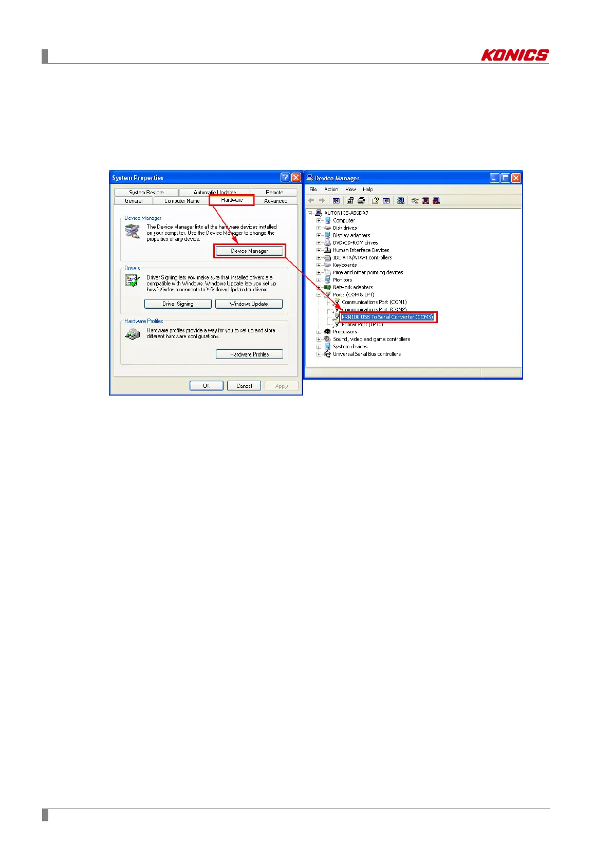 Check ‘Ports(COM & LPT)’ - 'KRN100 USB To Serial Converter (COMx)'.