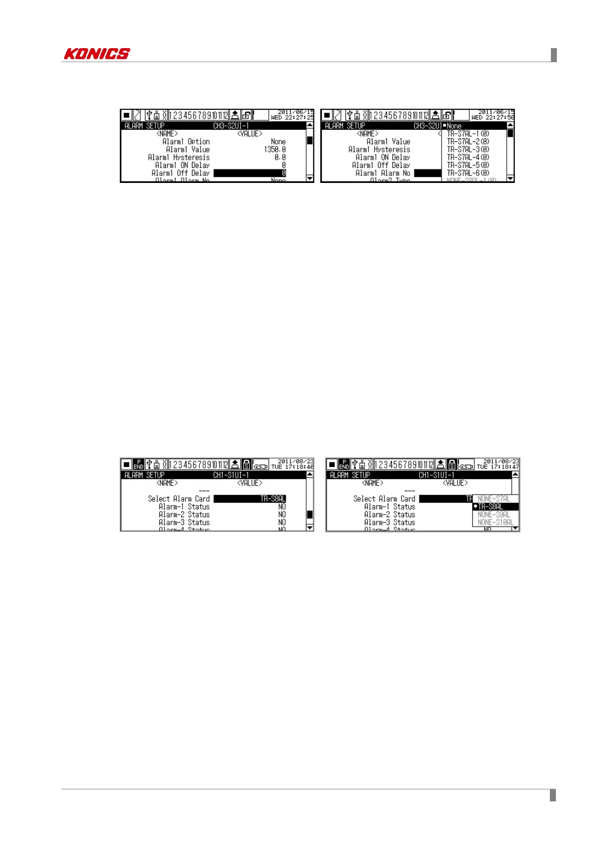 If the setting as ‘None’ and when alarm operation occurs, it displays alarm on the screen and