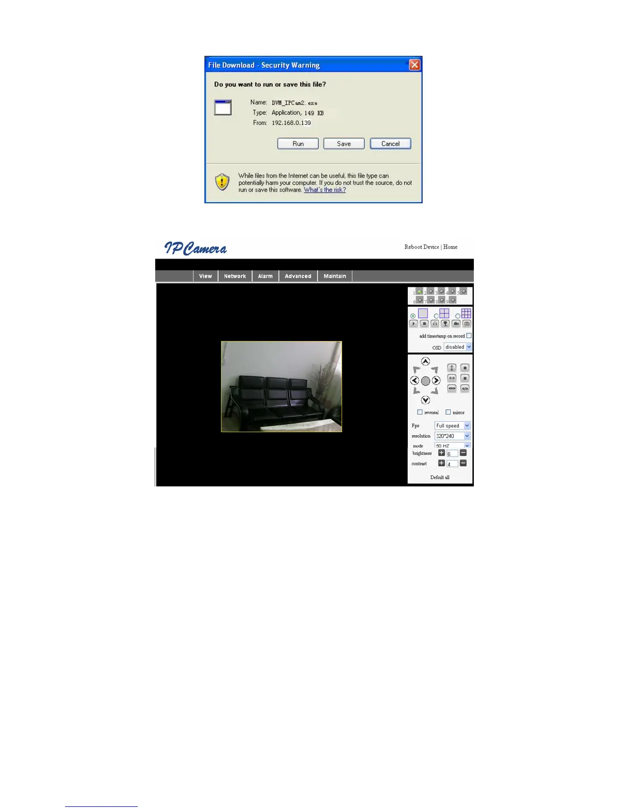 of the interface, including View, Network, Alarm, Advanced, Maintain, the submenu is on the right of the