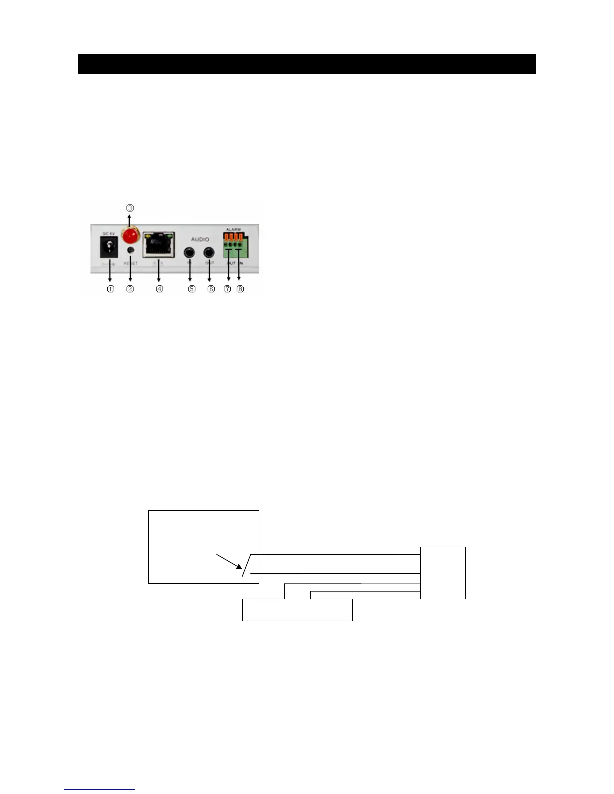 y Hälytysliitin: Hälytysliitin on liitetty IP-kameran releeseen. IP-kamera ohjaa kytkintä, joka laukaisee