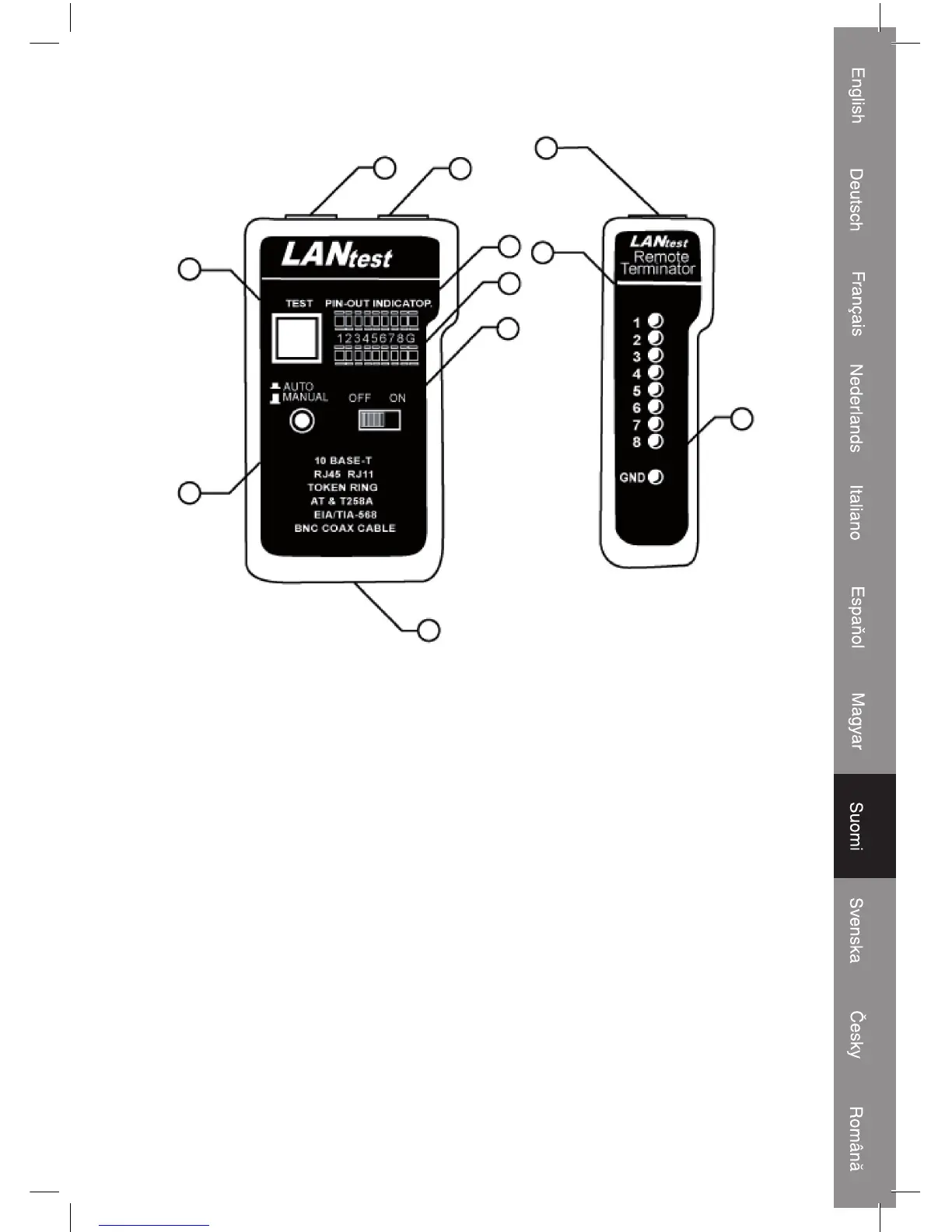 • Liitä testattavan kaapelin toinen pää lähteenä toimivaan RJ45-liittimeen (merkitty “”) ja
