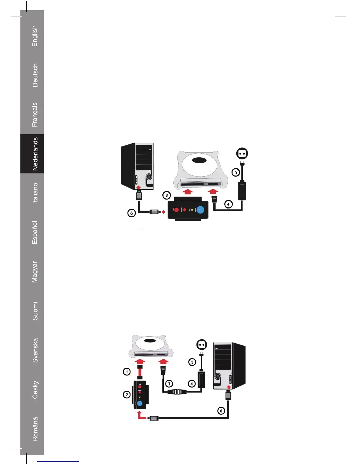 Sluit de IDE naar S-ATA voedingsadapterkabel (3) en het netsnoer (5) aan op de voedingsadapter