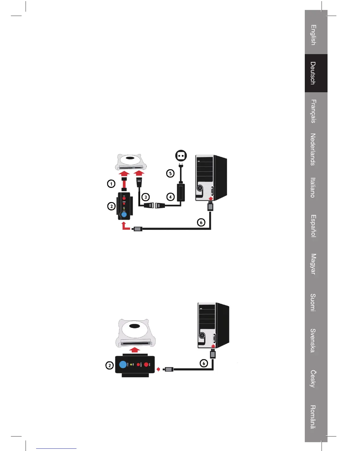Schließen Sie das IDE auf S-ATA Netzadapterkabel (3) und das Netzkabel (5) an den Netzadapter (4) an.