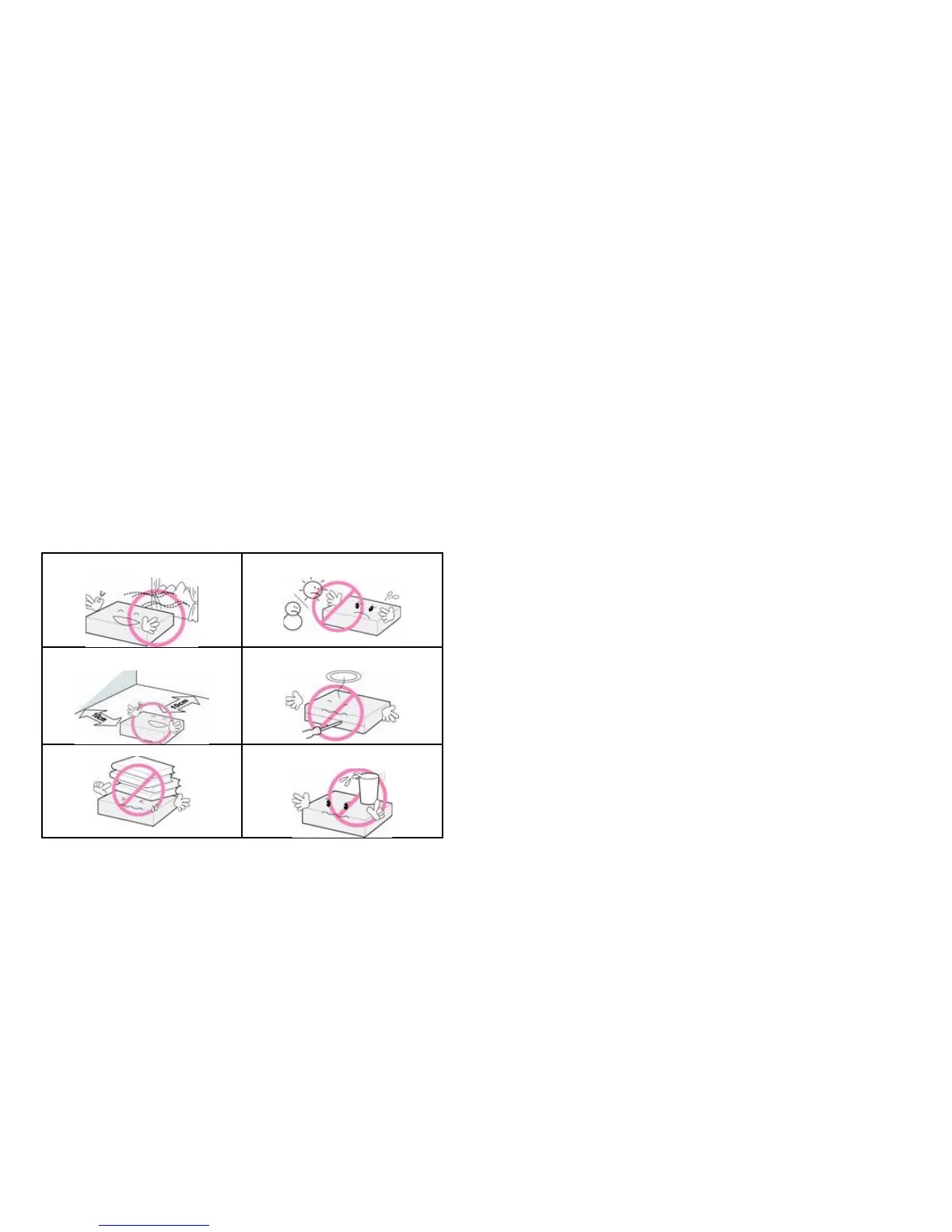 Don’t place objects on top of the product. Don’t place cups that hold water or other