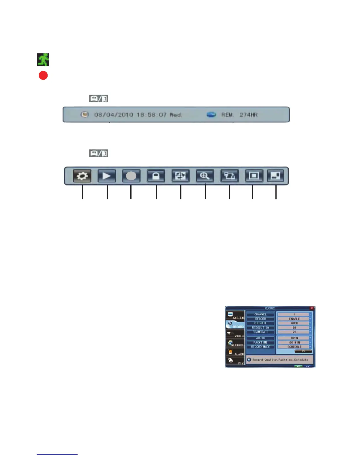 Select Toolbar System settings Record to enter the record menu. You can set quality, resolution,