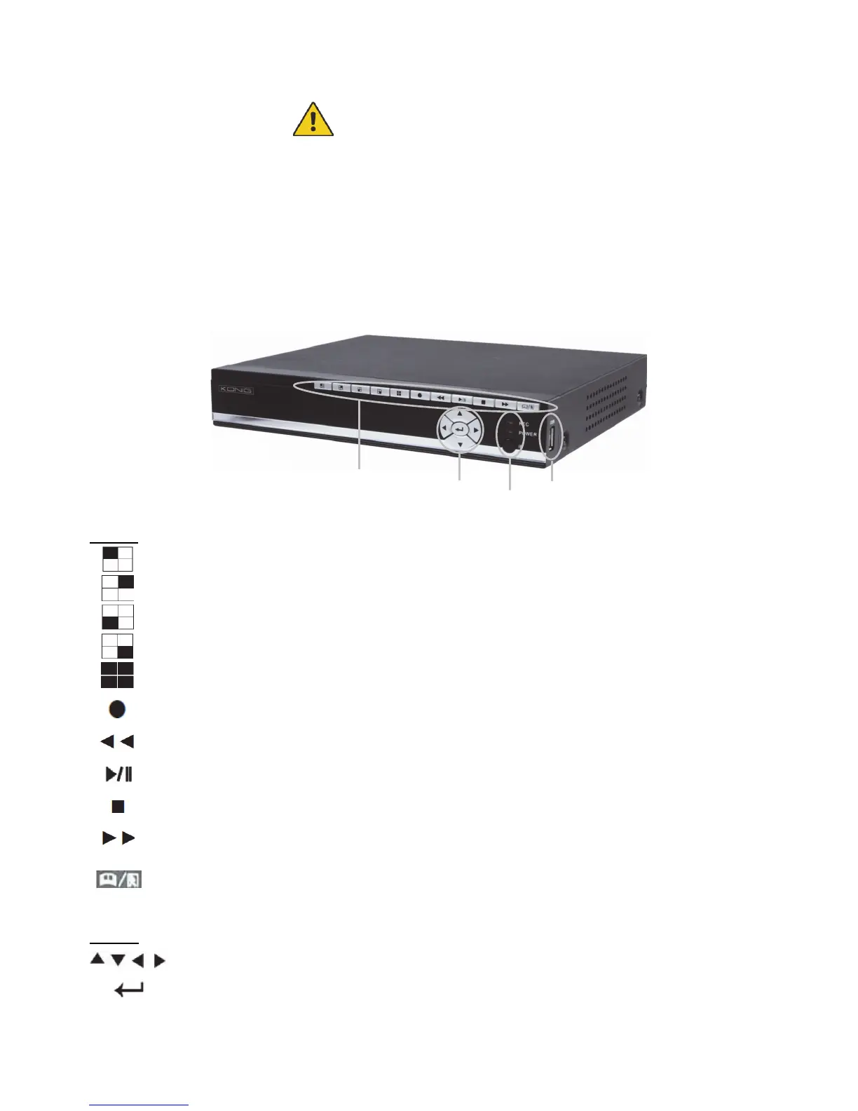 Beschrijving van de knoppen op het voorpaneel van de DVR en hun functies: