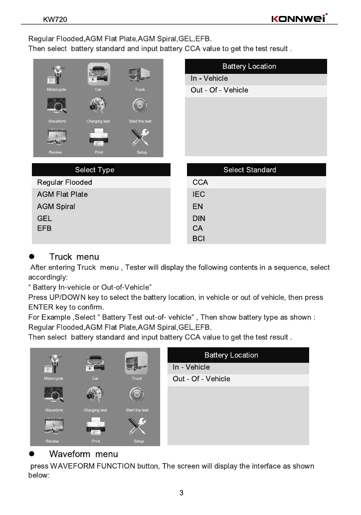 Konnwei KW720 - Truck and Waveform Menu Navigation; Truck Menu Guide; Waveform Menu Functionality