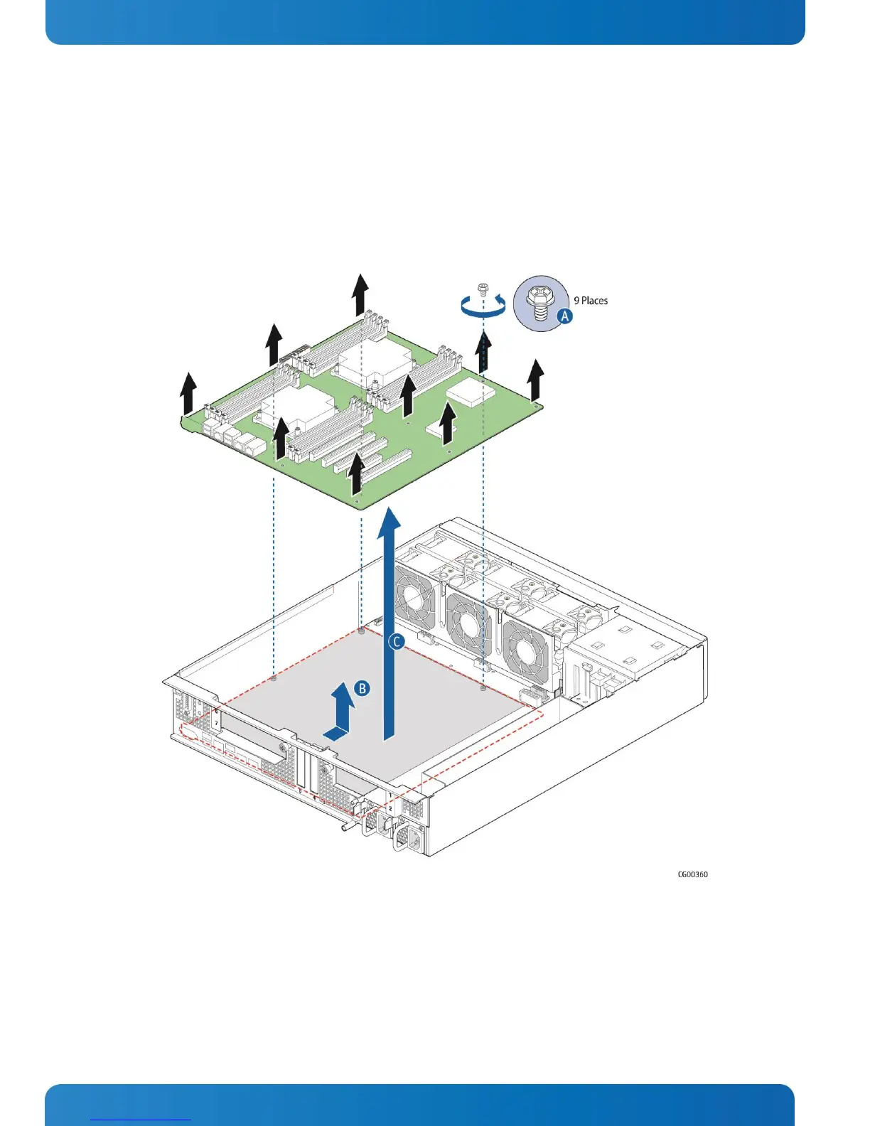 1. Loosen all nine screws holding the server board to the chassis and save them for use with the new server board. See