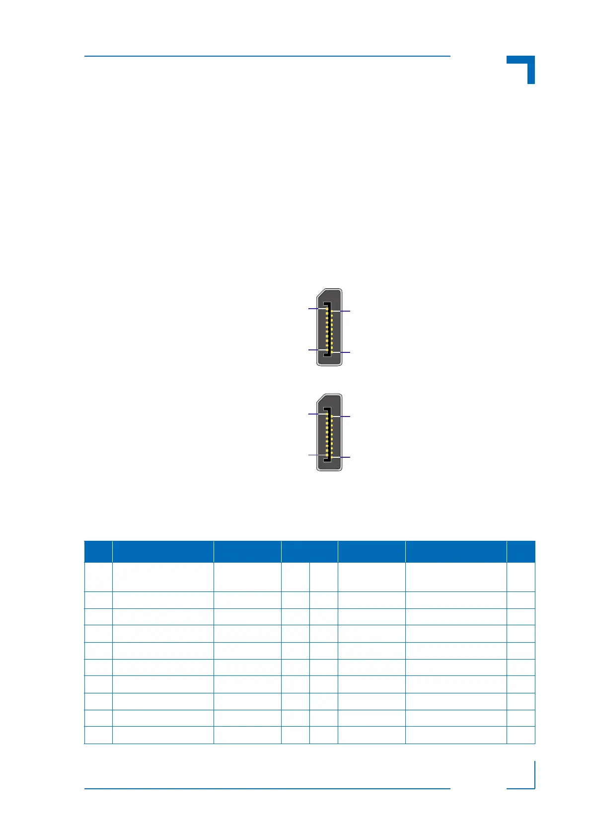 The following table indicates the pinout of the DisplayPort connectors J1 and J2.