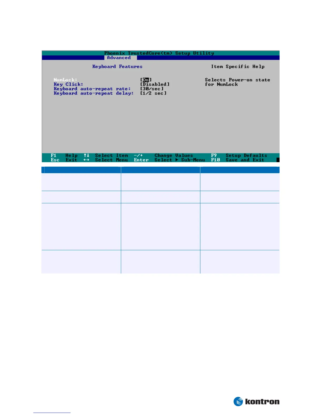 Keyboard Features Submenu