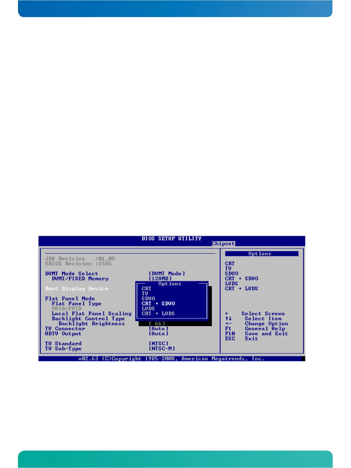 The BIOS must be set to enable the SDVO output during boot-up. Please enter the BIOS setup tool by pressing the