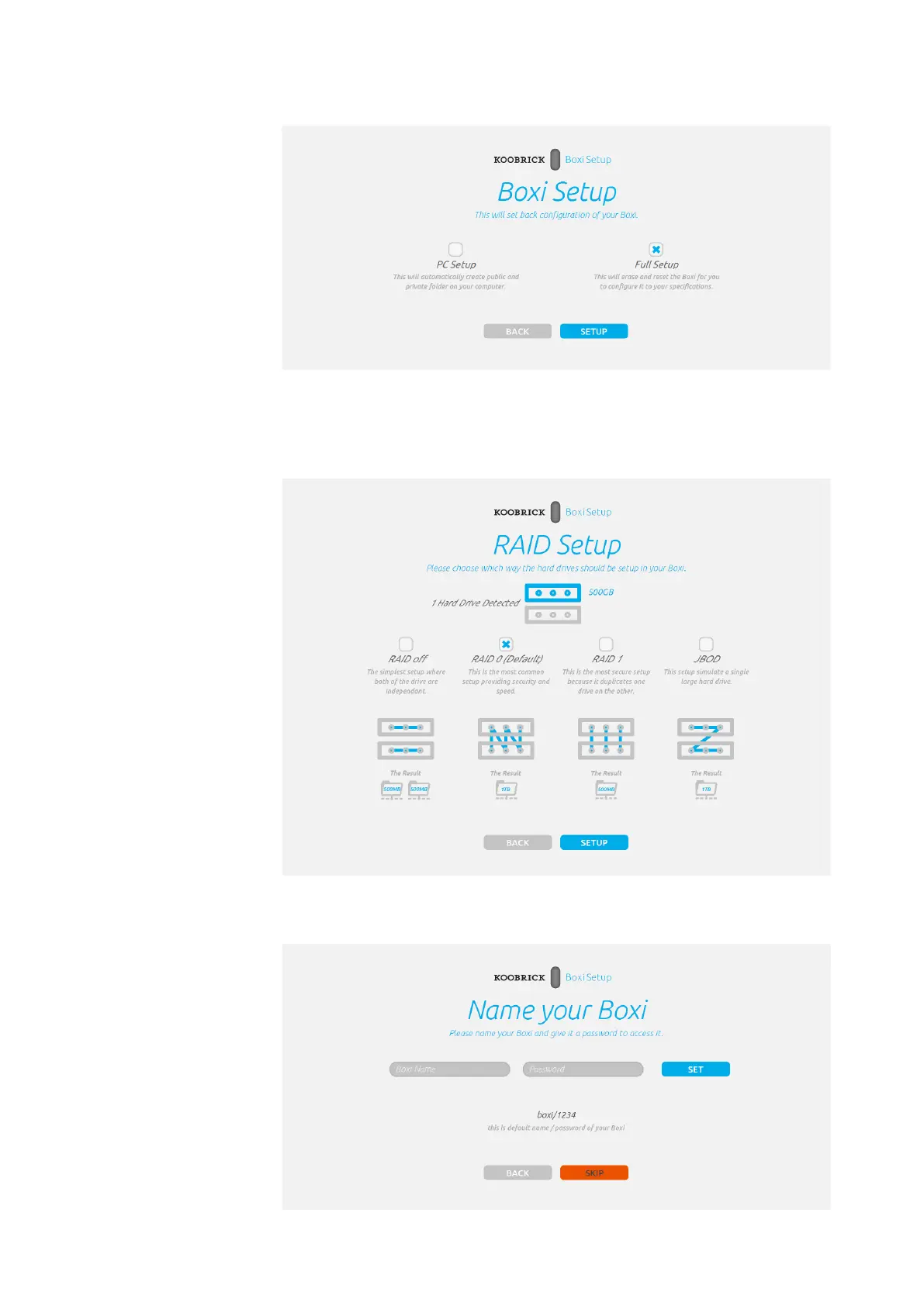 screen. Please select what kind of RAID setup you want to use for Koobrick Boxi and