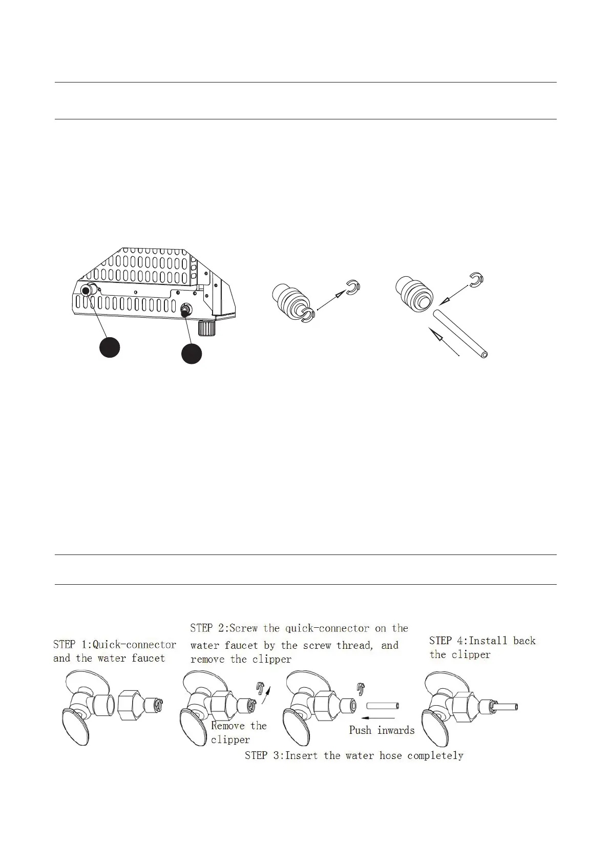 First, install the supplied water quick-connector to the water faucet by screw thread; Second, remove